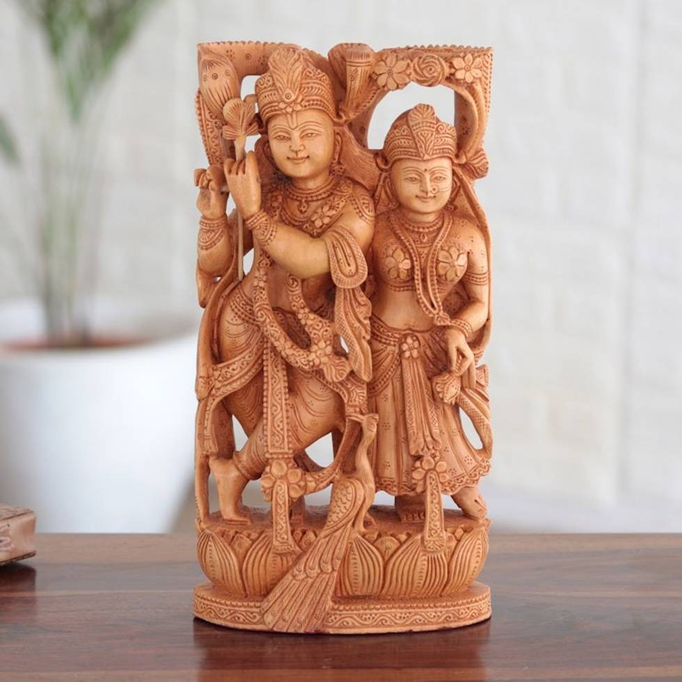 "Designed to portray the divine love between Hindu god and goddess Krishna and Radha, this stunning sculpture is presented by Motilal & Ayush. Indian artisans use local kadam wood to create the sculpture, diligently carving its intricate details by hand. Accompanied by a peacock, the couple are covered in lotus flowers that symbolize their love."