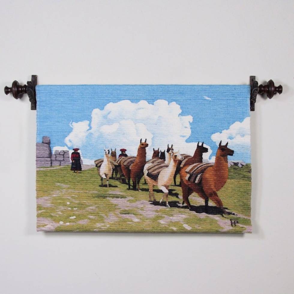"Dramatic cumulus clouds roll across the ruins of Sacsayhuaman, a site of unforgettable importance for the Inca culture of Peru. Their shaggy forms presented on green pasture, a caravan, or tropilla, of llamas heads towards an undefined destination. Handcrafted by Francisco Huaynate, the tapestry exalts the beauty of the woven arts. Says the artisan, 'Our textile art has always stood out because of the purity and joy of its colors. We maintain the tradition of the weaver from San Pedro, validating history and glorifying our textile art.'"