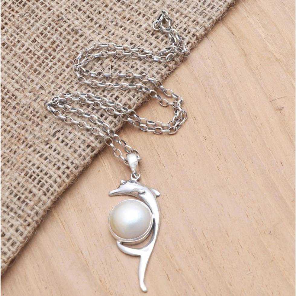 Hand Made Pearl and Sterling Silver Pendant Necklace 'Dolphin Show' Item ID: 2671746322