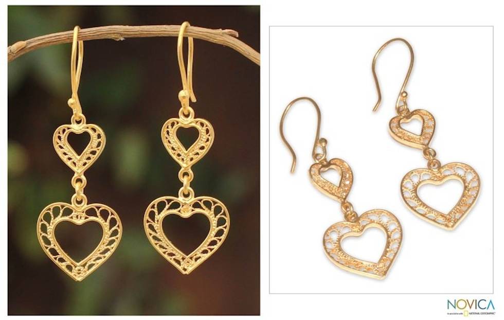 Hand Made Peruvian Gold Vermeil Filigree Earrings 'Our Two Hearts' Item ID: 2671820359