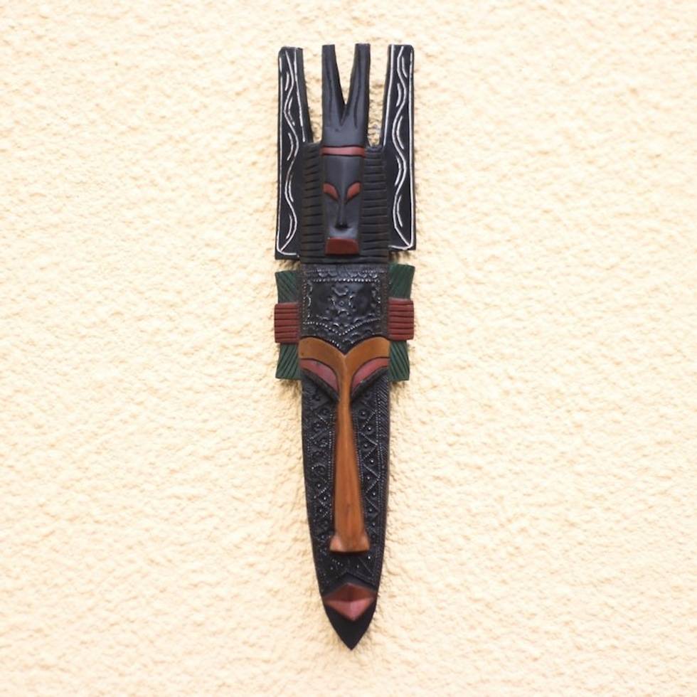 "Depicting a stoic face, this Ghanaian mask is hand-carved from local sese wood by Henry Acquah, finished in red and yellow and accented with embossed aluminum for rich textural interest. The gaze of this mask is fierce and immutable, with small horns at the top of the headdress for a distinctly African accent."