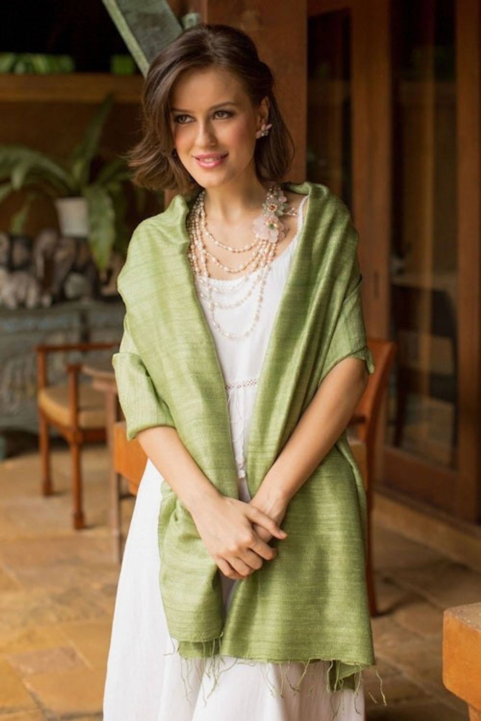 The finely pleated silk is warm but not bulky. It's long enough and wide enough to cover the shoulders as a shawl, but light enough to tuck into the neckline of a V-neck sweater as a scarf.