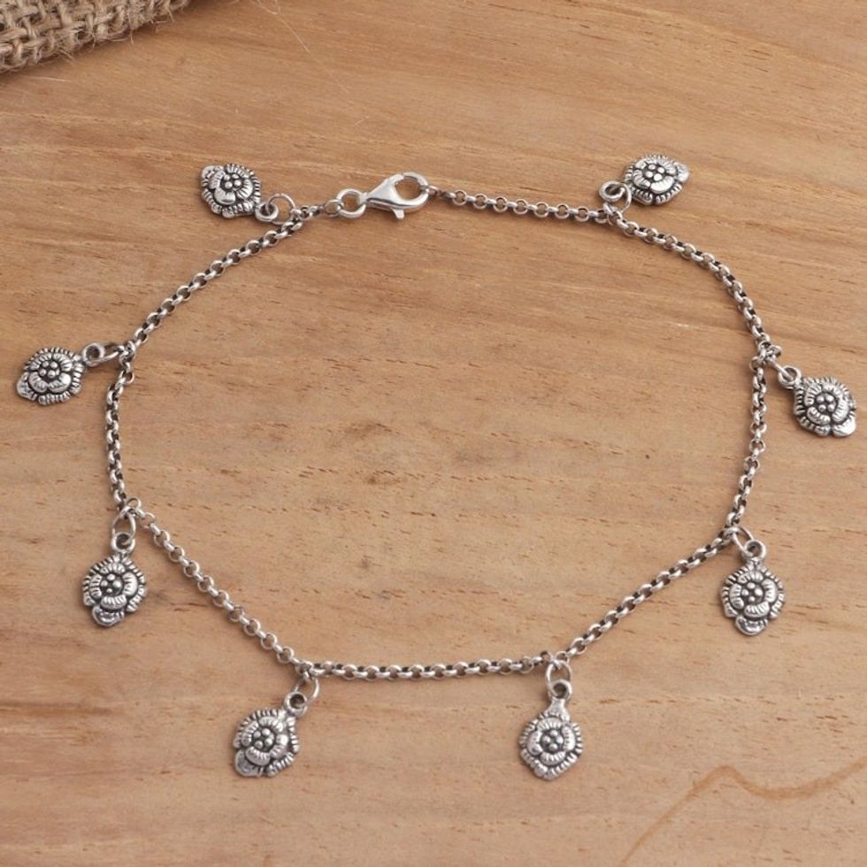 Hand Made Sterling Silver Floral Charm Anklet 'Floral Gleam' Item ID: 2671745482