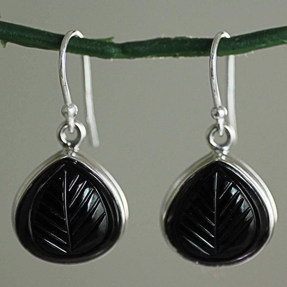 Hand Made Sterling Silver Onyx Dangle Earrings from India 'Betel Leaf' Item ID: 2671793010