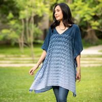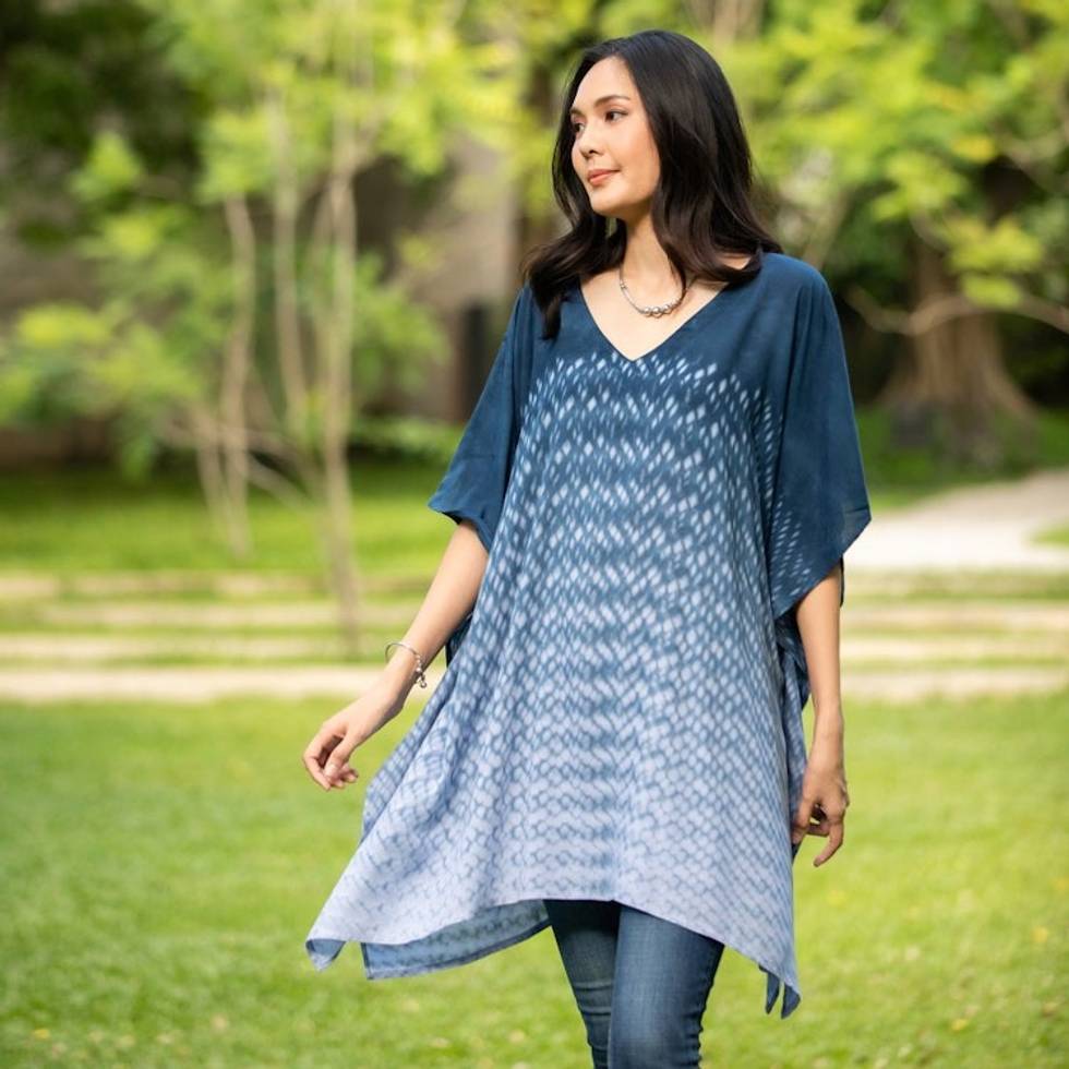 "Designed by Sakornrat Sinthurat, this caftan-style blouse features a loose cut for an elegant, ultra comfortable fit. Crafted from rayon, the caftan is hand-dyed by Thai artisans who use tie-dye techniques to achieve the garment's navy gradient."