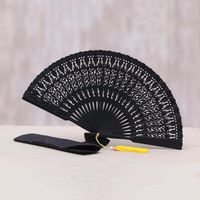 Hand Made Wood Fan in Black with Pouch from Indonesia 'Serenity Bloom in Black' Item ID: 2669914032