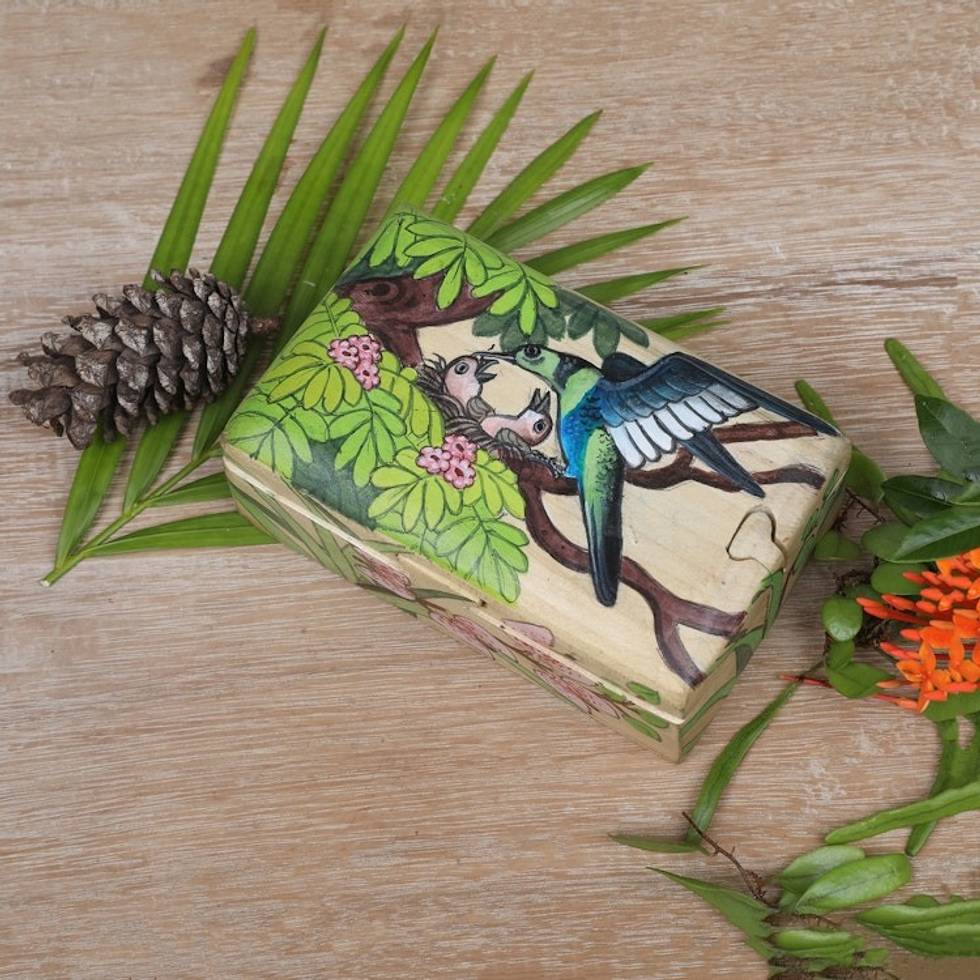 Hand-Painted Bird-Themed Suar Wood Decorative Box from Bali 'The Bird Nest' Item ID: 2671764861