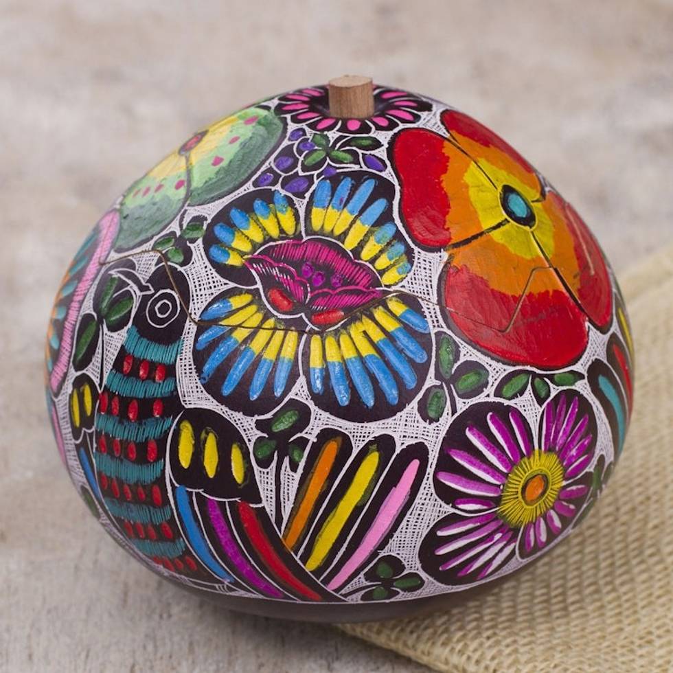 This gourd is carved and covered in colored song birds and flowers. It is quite lovely. Ms. Seguil is very, very talented and also patient to be able to carve such pretty things. Her carvings are extraordinary! I love her work and plan to purchase more.