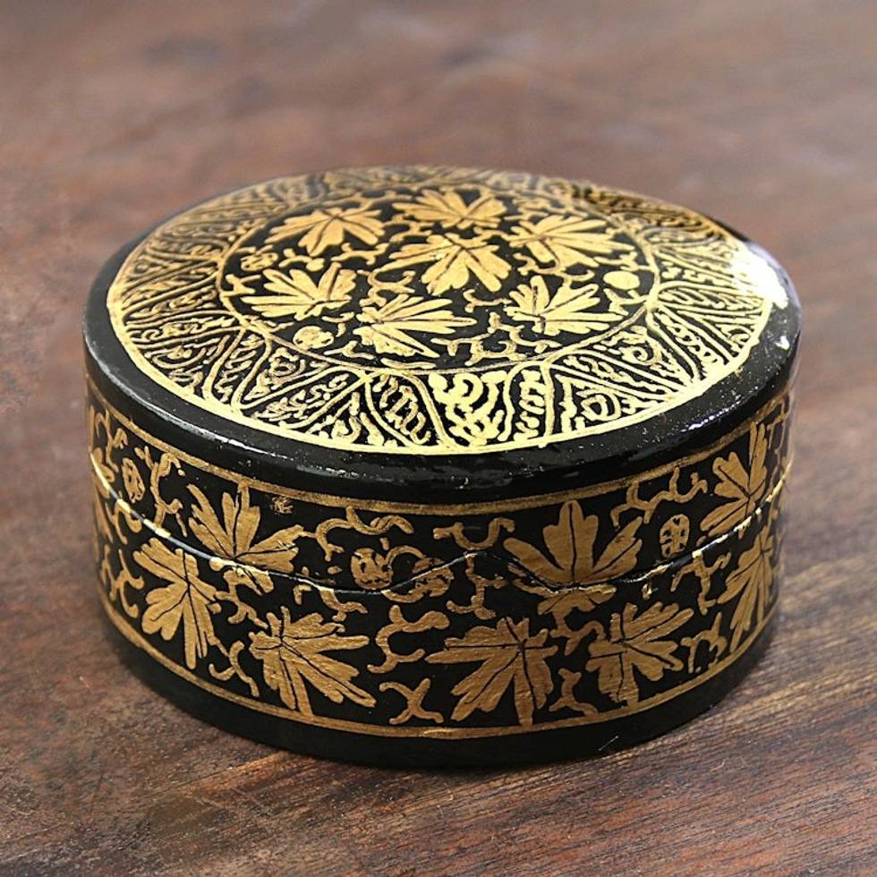 This box is one of three very lovely and beautifully decorated boxes I have from this artisan. "Midnight Beauty" is painted in brilliant gold with chinar flowers. It is very, very pretty. It looks so elegant and very much a box from India!