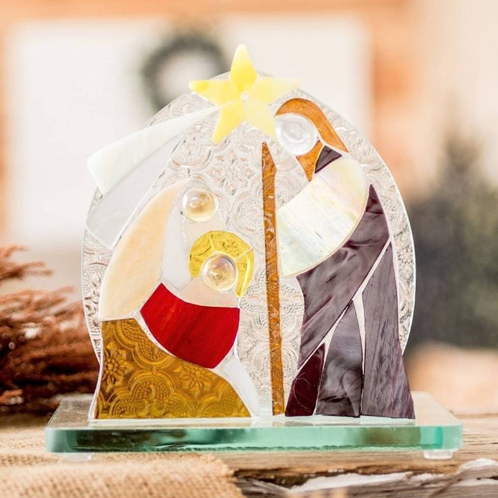Hand-Painted Blue and Green Float Glass Nativity Scene 'Blessed Family' Item ID: 2671769620