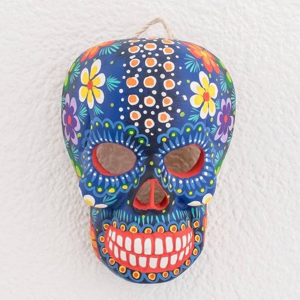 Hand-Painted Blue Floral Wood Skull Mask from Guatemala 'Life and Happiness' Item ID: 2671777002