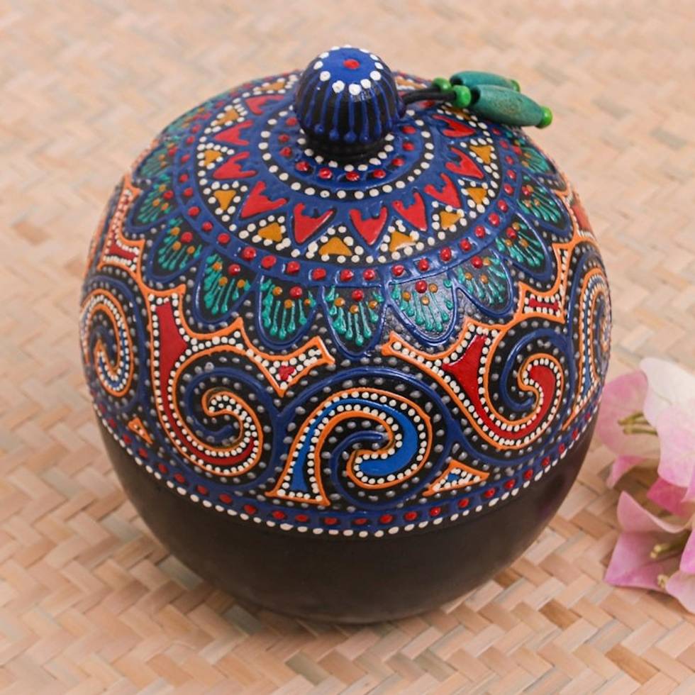 Hand-Painted Blue Mango Wood Decorative Box from Thailand 'Floral Circle in Blue' Item ID: 2671798181