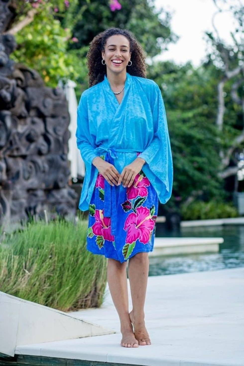 Hand-Painted Blue Rayon Robe from Bali 'Sky Lotus' Item ID: 2671745720