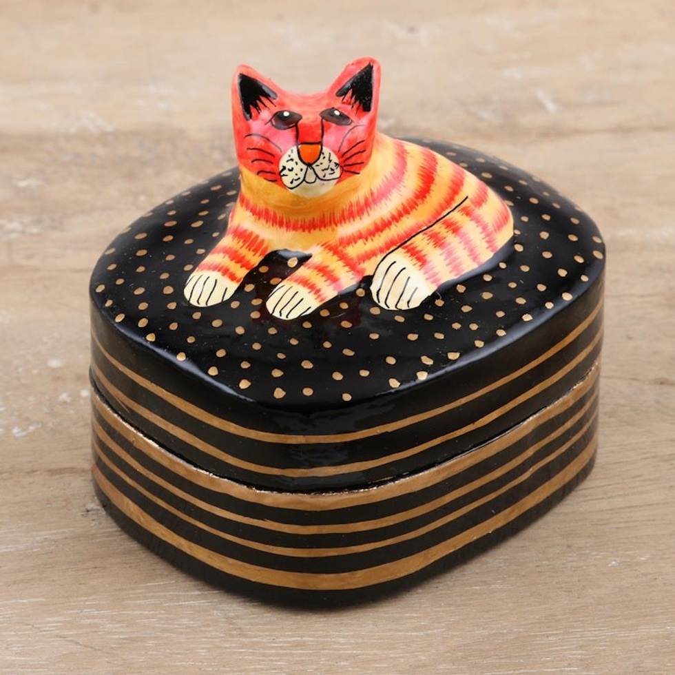 Hand-Painted Cat Papier Mache and Wood Decorative Box 'Feline Friend' Item ID: 2669892156