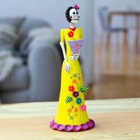 "The famous Catrina-an icon of femininity and tradition in the celebrations held in honor of the Day of the Dead-arrives in a stunning floral dress that evokes the refreshing side of Mexico's spring season. Master artisan Jorge Escamilla captures the icon's enigmatic and jolly beauty in a ceramic sculpture painted by hand in a palette of yellow hues. The piece also holds a little fane in one hand, symbolizing natural grace."
