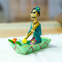 Hand-Painted Catrina on a Boat Ceramic Figurine in Mint Hues 'River Catrina in Mint' Item ID: 2671807285