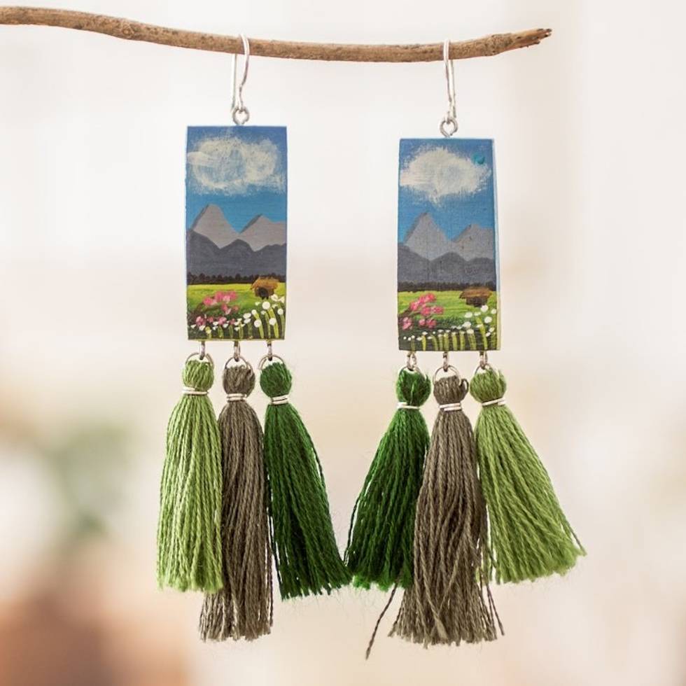 Hand-Painted Cedarwood Dangle Earrings with Green Tassels 'Beloved Landscapes' Item ID: 2671770997