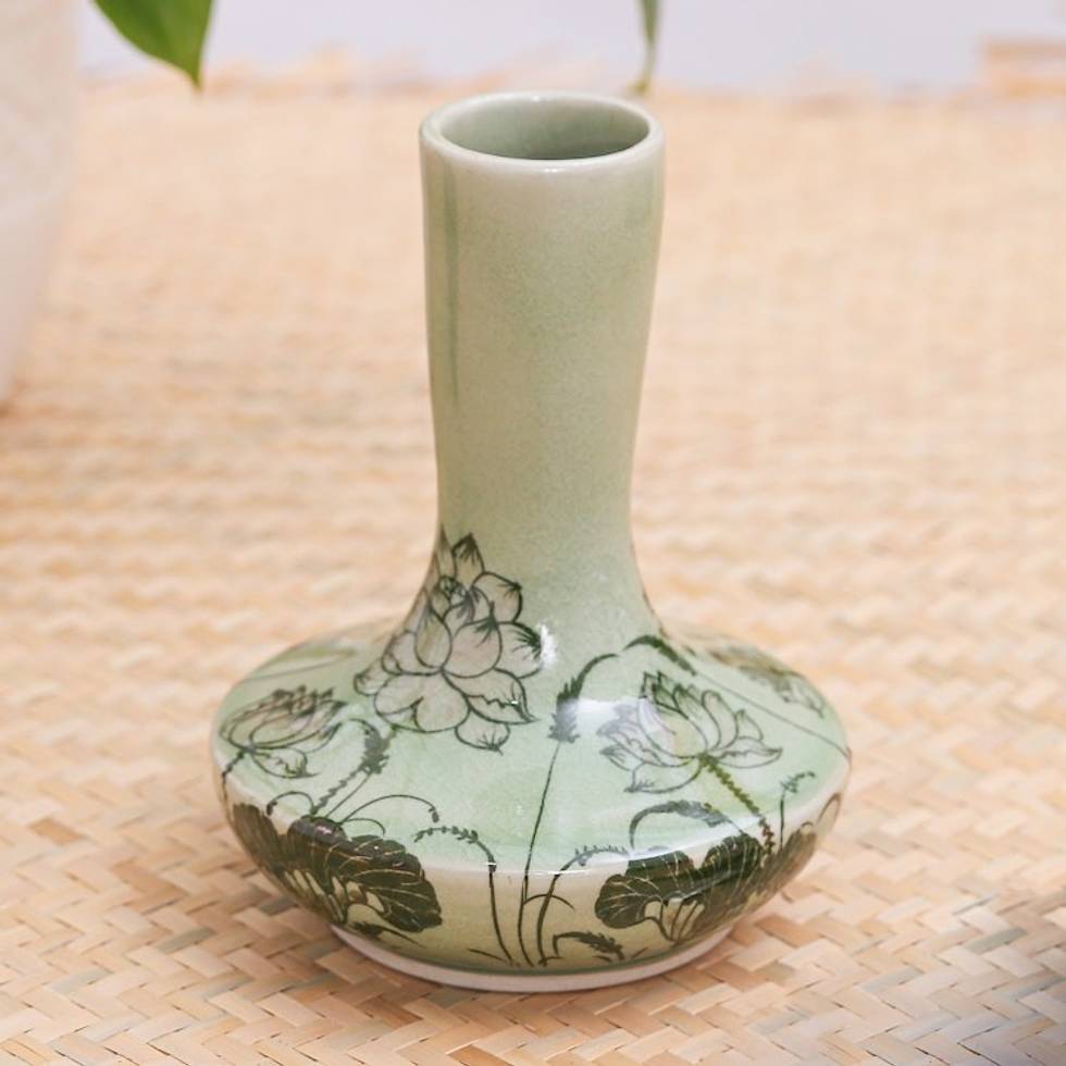 Hand Painted Celadon Ceramic Floral-Themed Vase 'Fresh-Cut Lotus' Item ID: 2669897589