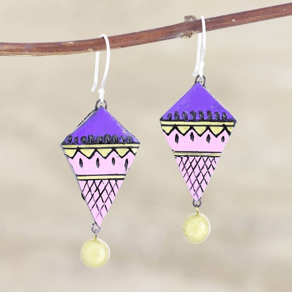 Hand Painted Ceramic Dangle Earrings from India 'Pink Trapeze' Item ID: 2671790033