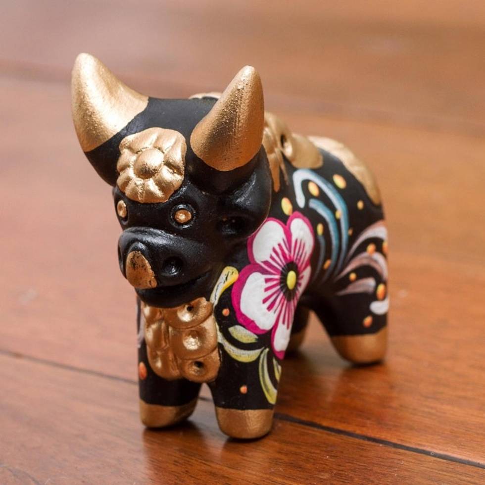 Hand Painted Ceramic Floral Bull in Black from Peru 'Little Black Pucara Bull' Item ID: 2669891144