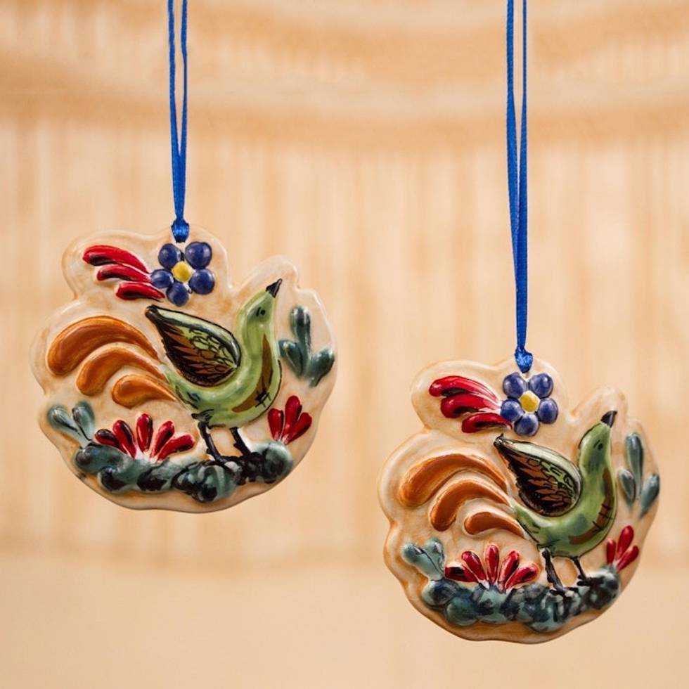"Raising its little head to the morning sky, a lovely green bird is featured in this pair of ornaments from Mexico. Created by Gorky Gonzalez, these ornaments are crafted from ceramic and painted by hand in the traditional style of Maiolica handicrafts. Each ornament is marked with the artisan's signature, as well as the letters 'AT' for Alfareria Tradicional (Traditional Pottery)."