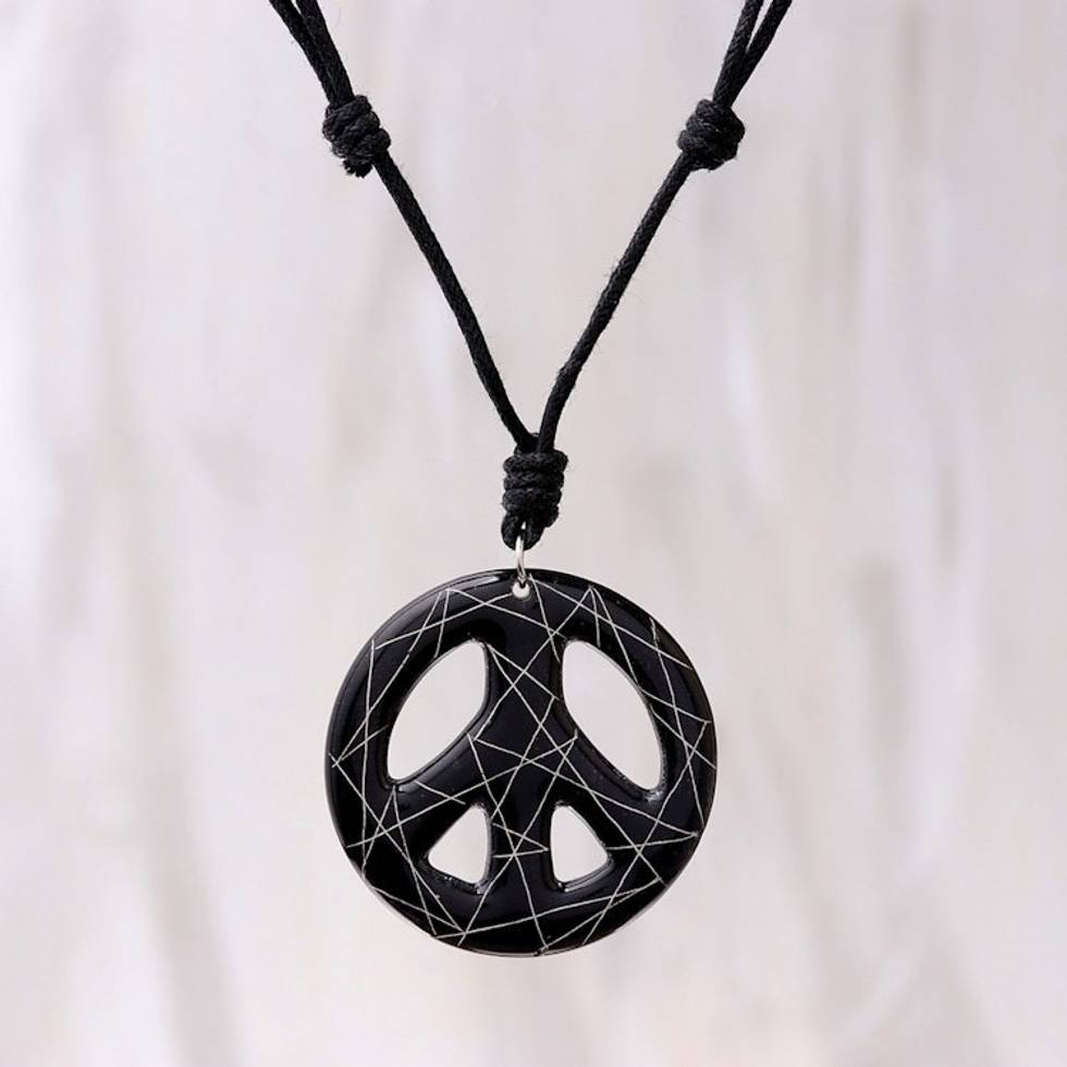 Hand-Painted Ceramic Peace Necklace in Black from Thailand 'Bring Peace in Black' Item ID: 2671798733