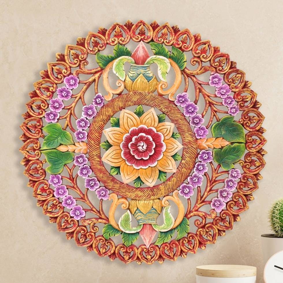 Hand Painted Circular Teak Wood Relief Panel from Thailand 'Splendid Garden' Item ID: 2671798101