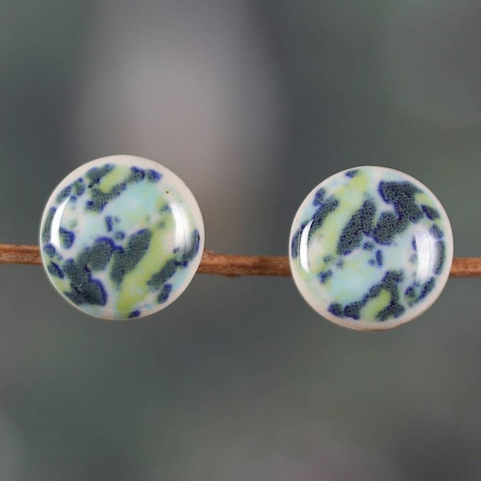Hand-Painted Colorful Ceramic Button Earrings from India 'Sea Beauty' Item ID: 2671786960
