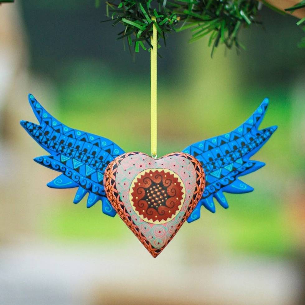 Hand-Painted Copal Wood Winged Heart Ornament in Cyan 'Cyan Wings of the Heart' Item ID: 2671807499