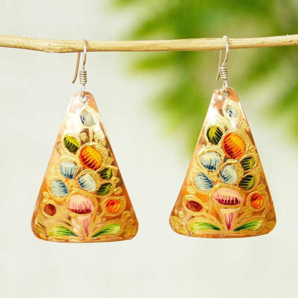 Hand Painted Copper Triangular Dangle Earrings from Mexico 'Floral Pyramid' Item ID: 2669926938