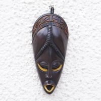 Hand-Painted Dark Brown and Yellow African Sese Wood Mask 'Nyame Nsa' Item ID: 2671804057