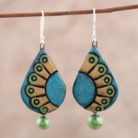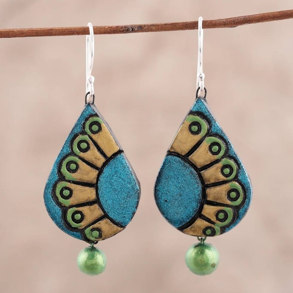 Hand-Painted Droplet Ceramic Dangle Earrings from India 'Feather Droplet' Item ID: 2669924566