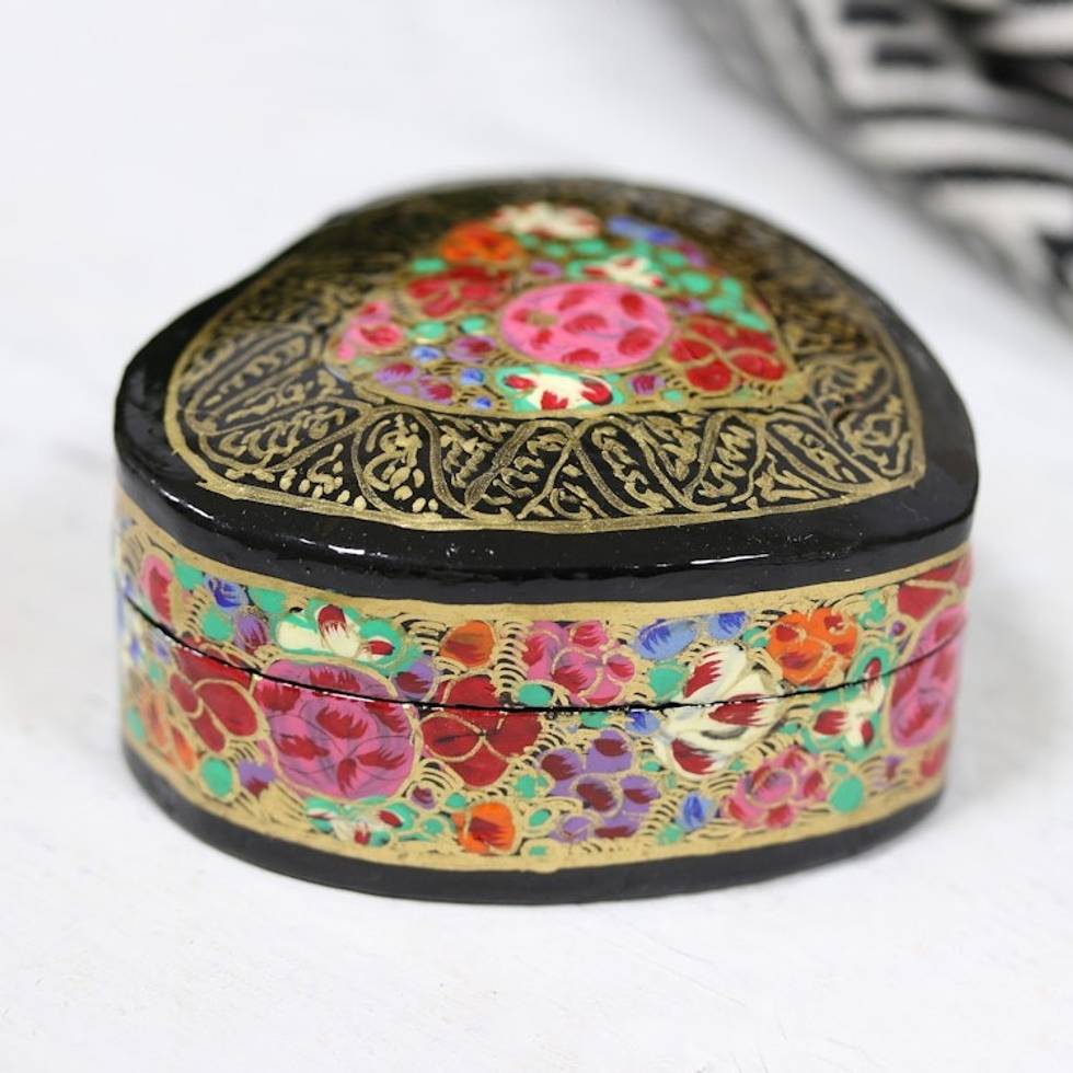 This box is one of three very lovely and beautifully decorated boxes I have from this artisan. "Cheerful Flare" is painted in flowers that represent the flowers of the Kashmir Valley in India. It has many beautiful colors, including red, rose, orange, green and purple! A very pretty box.