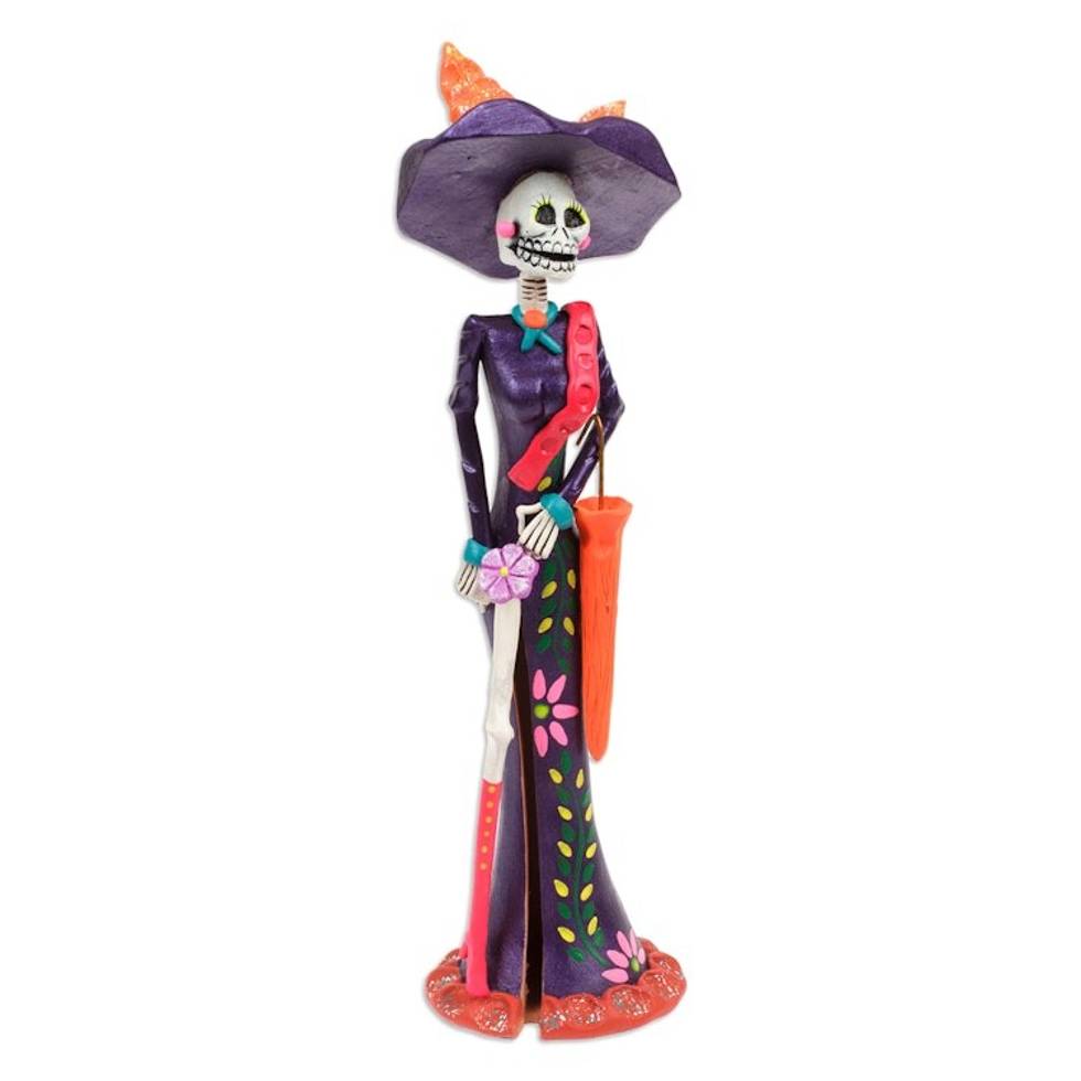 Hand-Painted Floral Blue-Violet Catrina Ceramic Sculpture 'The Elegant Catrina' Item ID: 2671807311