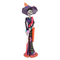 "Beauty, charm and elegance emerge from this graceful Catrina, wearing the best garments for a glamorous Day of the Dead party. Mexican artisan Jorge Escamilla works with ceramic to create this sculpture in honor of the region's customs, portraying the popular Catrina in a sophisticated blue-violet dress ornamented with floral details, all painted by hand."
