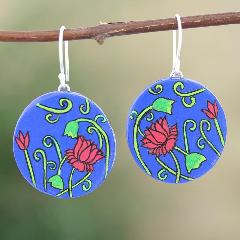 Hand Painted Floral Dangle Earrings 'Pichwai Art' Item ID: 2671789084