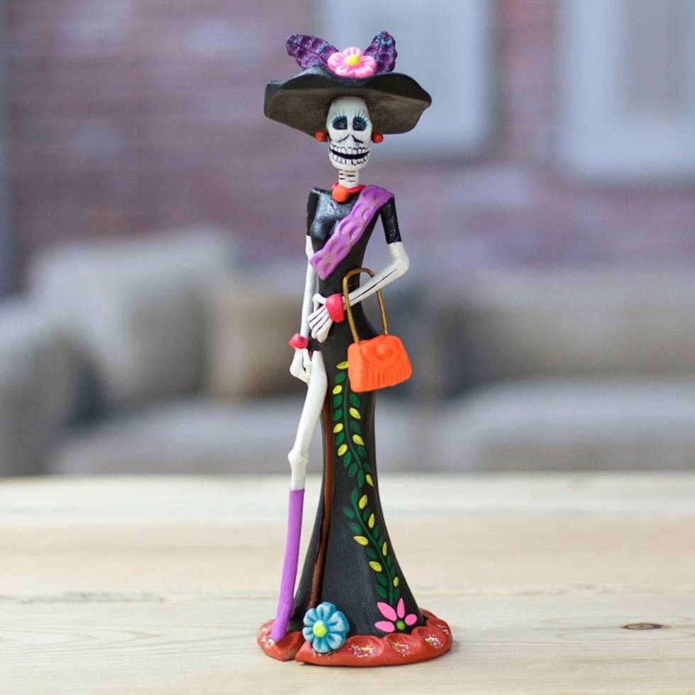 Hand-Painted Floral Lady Catrina Ceramic Sculpture in Black 'Lady Catrina at the Gala' Item ID: 2671807538