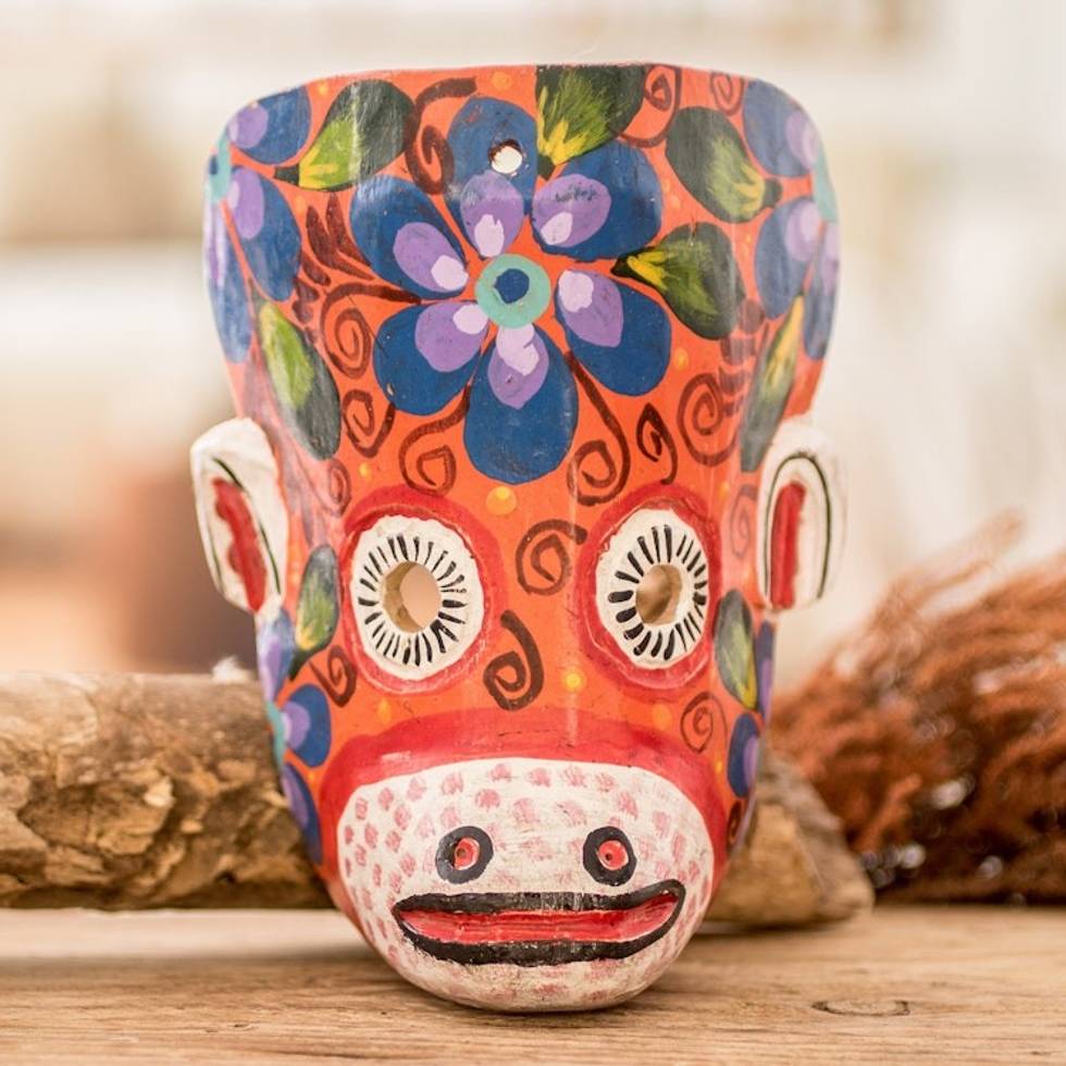 Hand-Painted Floral Monkey Pinewood Mask in Orange 'Monkey's Celebration' Item ID: 2671625956