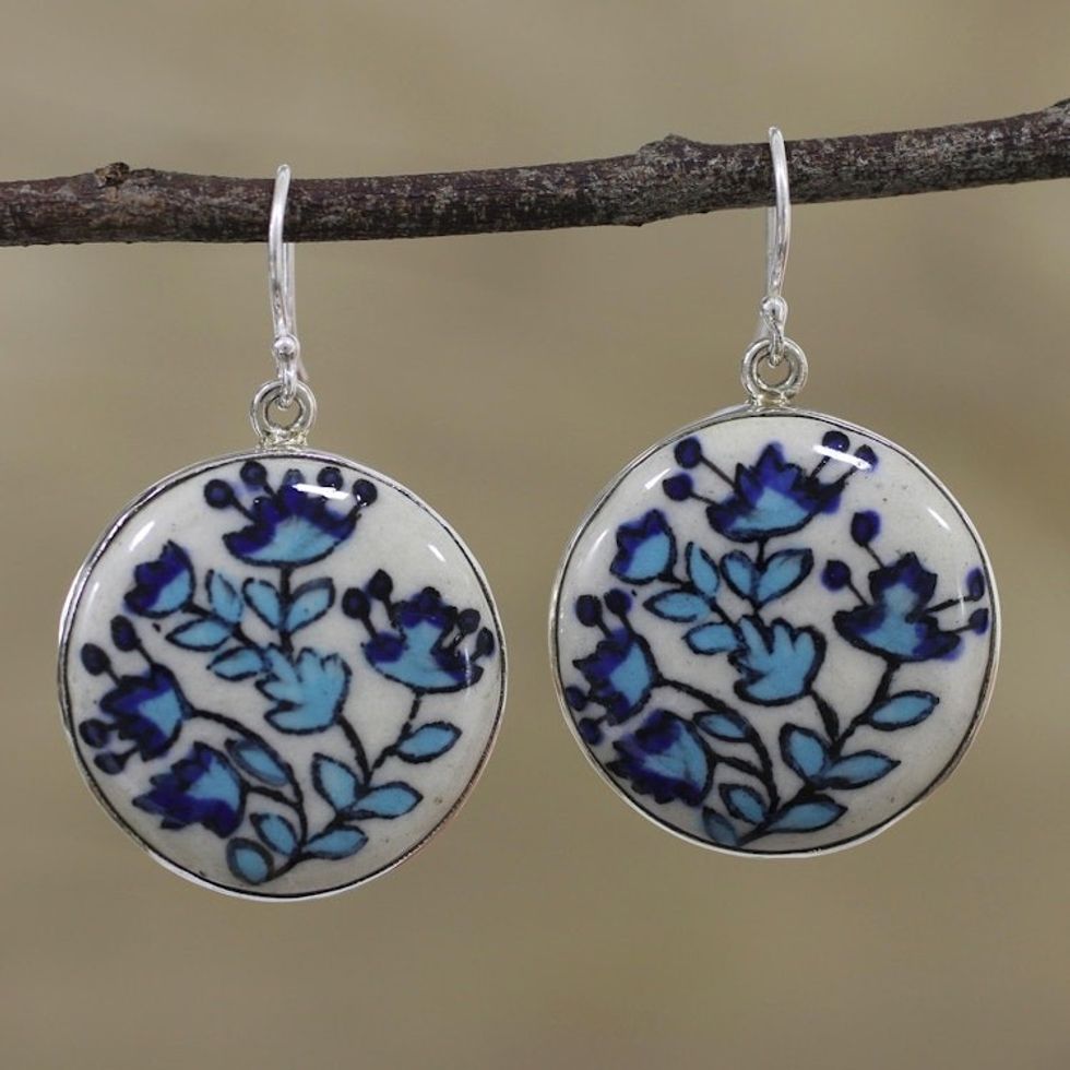 Hand-Painted Floral Sterling Silver Earrings from India 'Blossom Dance' Item ID: 2671791269