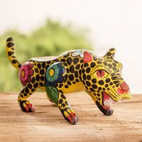 Hand-Painted Floral Wild Cat Wood Figurine from Guatemala 'Jarring Jaguar' Item ID: 2671772458