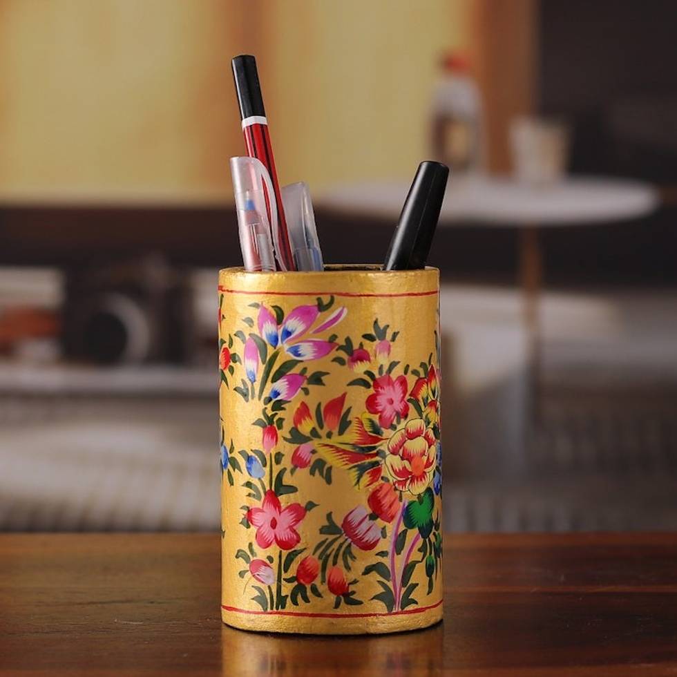 Hand-Painted Floral Wood and Papier Mache Pen Holder in Gold 'Floral Sunshine' Item ID: 2671783259