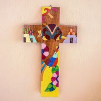 Hand-Painted Folk Art-Themed Pinewood Wall Cross 'Nature Peace' Item ID: 2671627011