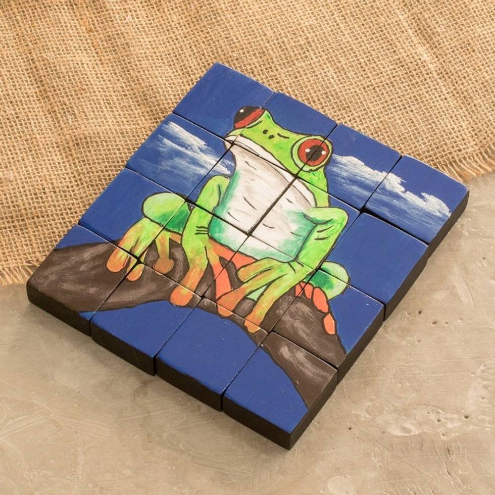 Hand-Painted Frog-Themed Pinewood Puzzle with 16 Pieces 'Tropical Croak' Item ID: 2671769499