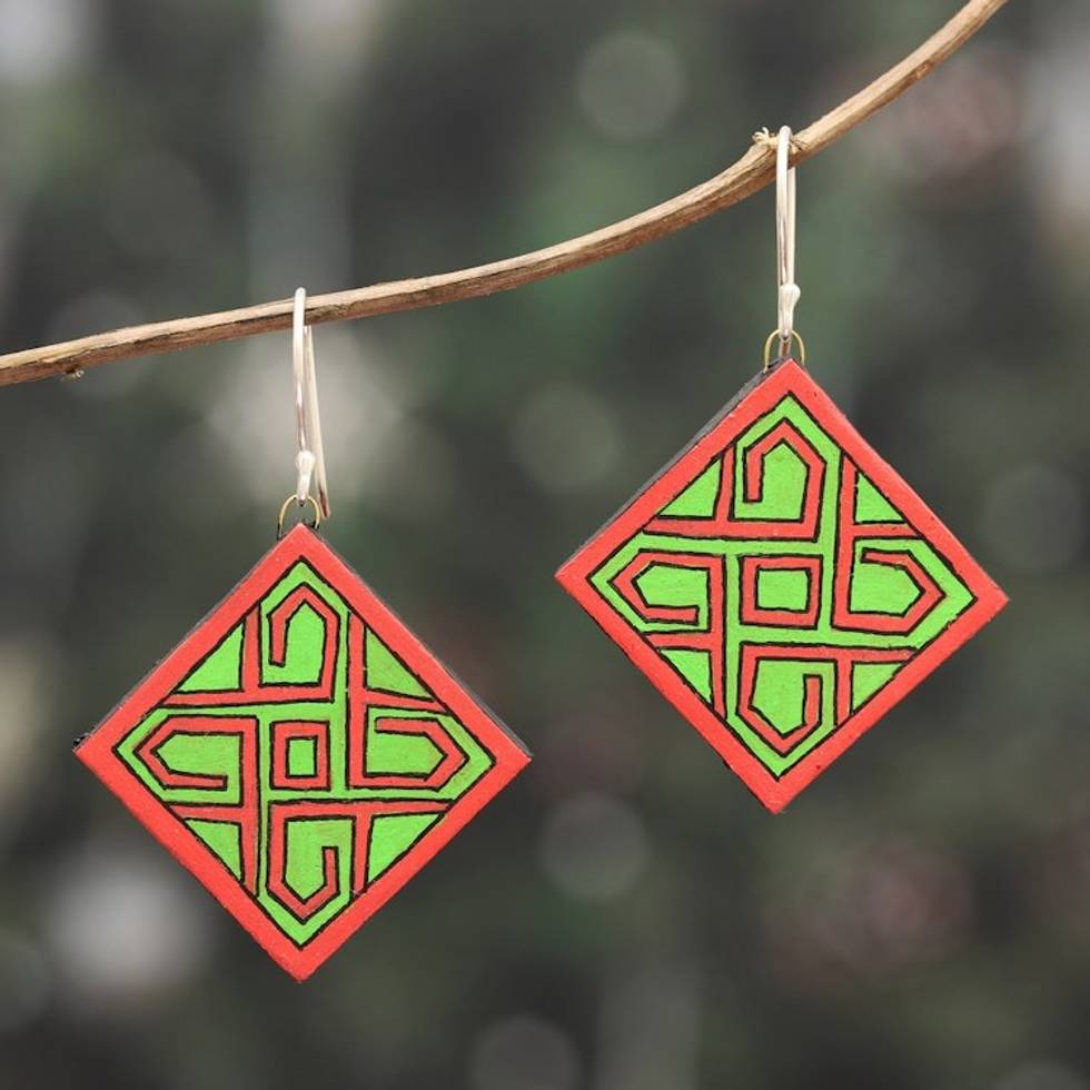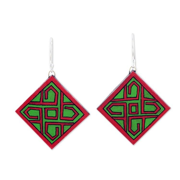 Hand-Painted Geometric Green and Red Ceramic Dangle Earrings 'Green Knot' Item ID: 2671787077