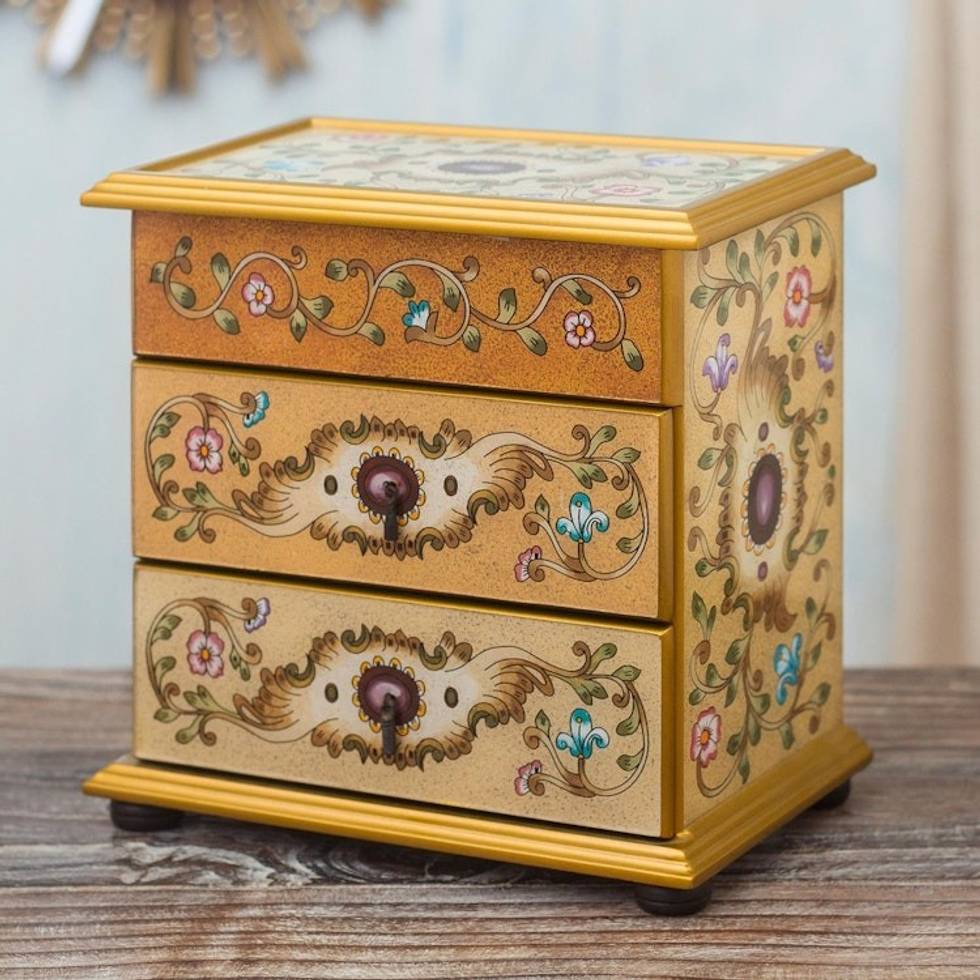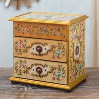 I received my new jewelry box and it's so beautiful. It's very well made and the colors are so vibrant. My only (small) complaint is the black paint inside the drawers. I think it would be better if the wood were stained a lighter color inside. Somehow the black color makes things harder to find. But otherwise this is a stunning piece and holds all my pins and bracelets.