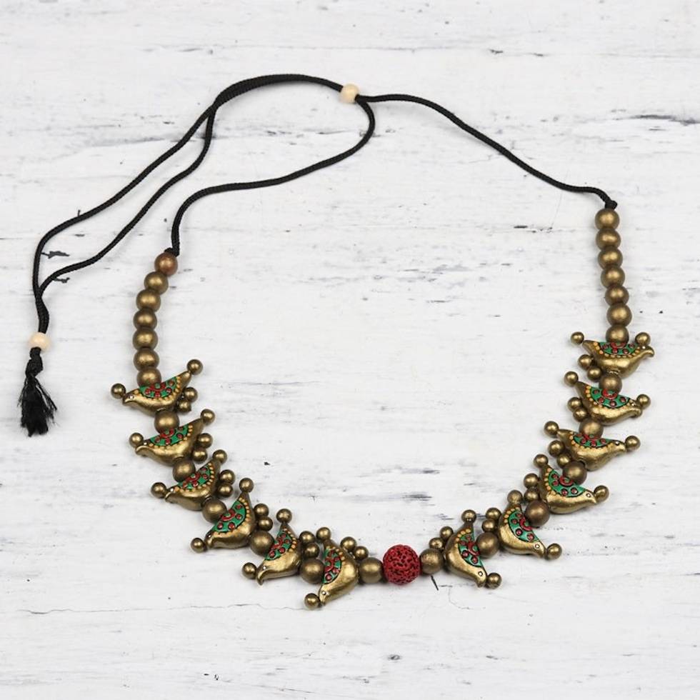 Hand-Painted Golden Birds Ceramic Beaded Adjustable Necklace 'Golden Birds' Item ID: 2671790552