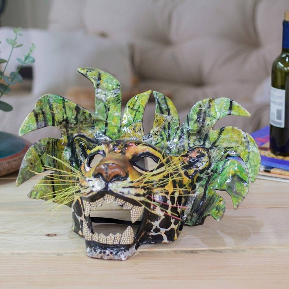 Hand-Painted Lacquered Mexican Jaguar Papier Mache Mask 'Green Jaguar' Item ID: 2671807302