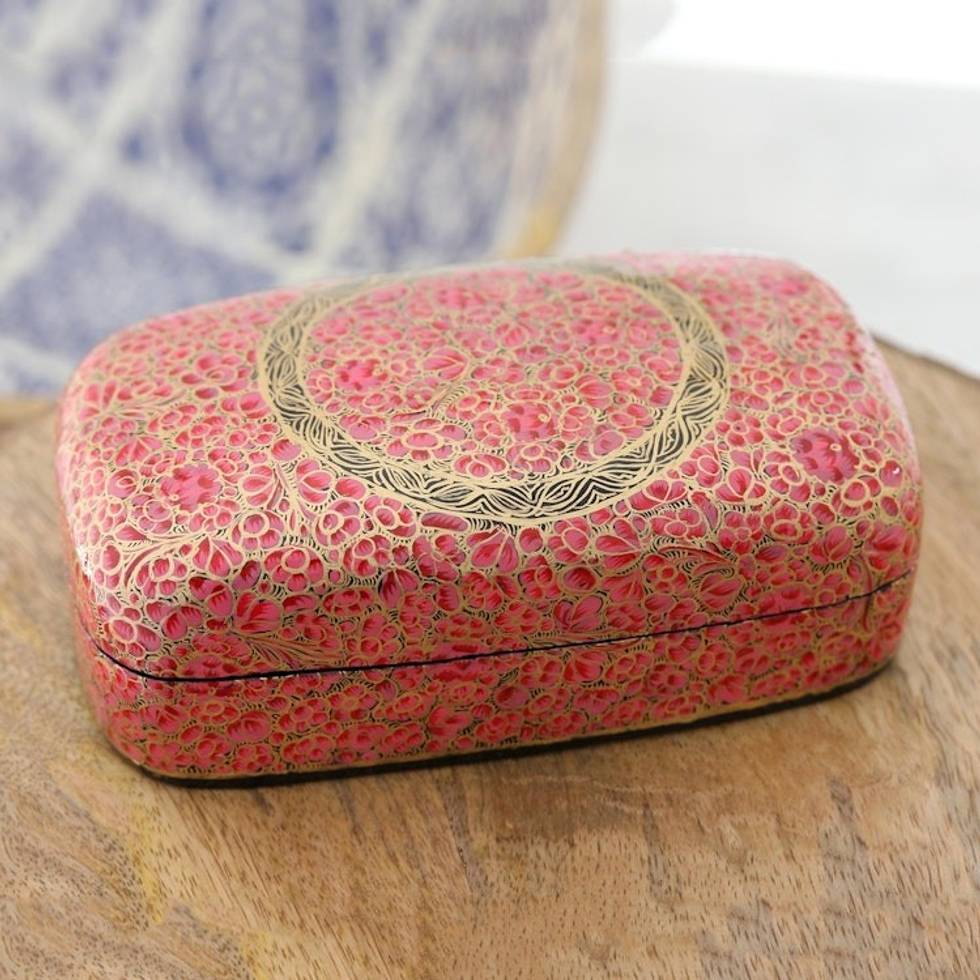 Hand-Painted Laquerware Papier Mache Box 'Kashmir Cheer in Pink' Item ID: 2671788262