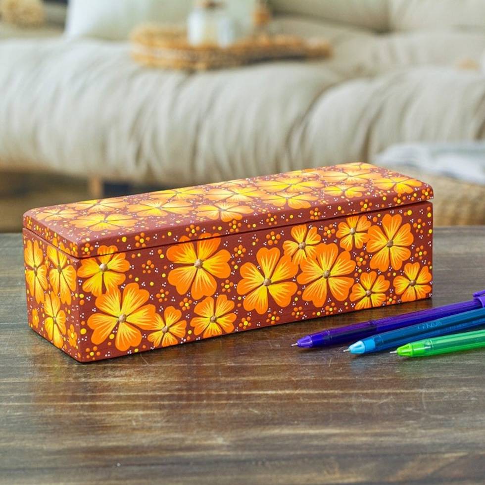 Hand-Painted Orange Decorative Wood Box with Floral Details 'Summer Eden' Item ID: 2671807819