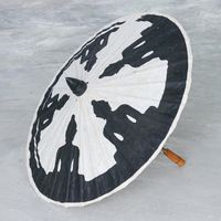 "Hand-painted with a stunning black and ivory motif, Nikom's parasol is just the thing to brighten your home. To create the parasol, the Thai artisan stretches handmade saa paper over a sturdy bamboo frame before painting the surface with a contrasting Buddha motif."